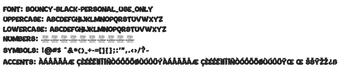 Bouncyの多様性は、さまざまなスタイルで創造的にレイヤーしたり組み合わせたりすることを可能にし、タイトル、見出し、ダイナミックなフレアを必要とするプロジェクトを強化します。このフォントは、ソリッドブラックまたは軽いストロークのいずれであっても優れた可読性を保証し、すべてのデザインに動きと楽しさを注入します。全体として、Bouncyは、あらゆるクリエイティブな取り組みに喜びと自発性を招く魅力的なフォントです。